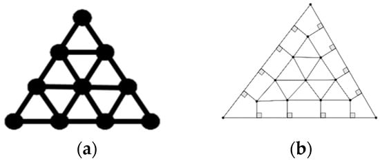 There are tangency relations among all circles inside the triangle, as shown in the tangency graph for all circles (see Figure 3a). In the graph for the circles in the Tri(Tn) problem, the vertices represent circles, and the edge connecting two vertices represents the external tangency relation between these two circles. The circle Ci,j, i = 2, …, n, j = 1, …, i − 1, (with radius ri,j) is tangent to the next circles Ci,j+1 in the same row, and tangent to the circle in the next row Ci+1,j and Ci+1,j+1, for i = 1, …, n − 1, j = 1, …, i in the next row. Figure 3a is an example of the tangency relations for T4 = 10 circles inside the triangle. Besides the tangency property among circles, some circles are also tangent to the sides of the triangle. To add the tangency relation between the circle and the side of the triangle, we added a triangle to surround these circles and an edge to connect the vertex that represents a circle to the sides of the triangle; an example for T4 is shown in Figure 3b. Note that the tangency graph is a helpful tool for knowing the tangency relation among the circles and sides of the triangle, but it is not a solution to our problem because we do not know the circle centers and radii for all circles yet. Therefore, the Figure 3b is a tangency graph for the Tri(T4) problem. And, given the coordinates of the three vertices of a triangle, the associated solution is shown in Figure 13c.