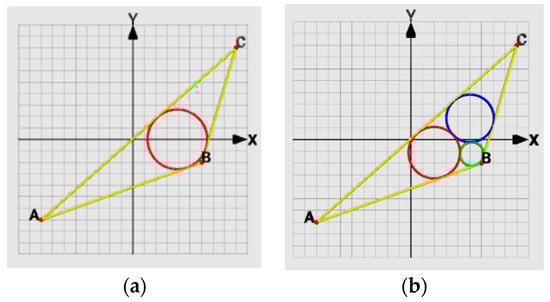 Consider the inner circle for the Tri(Tn) problem, as shown in Figure 9c. The angles , , , can be computed using Theorem 3, and the radius of the inner circle can be computed by Algorithm 1.