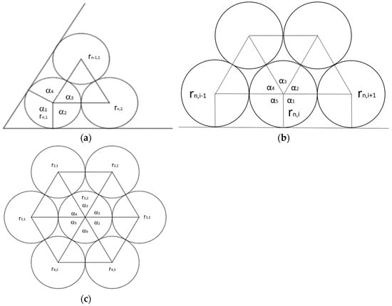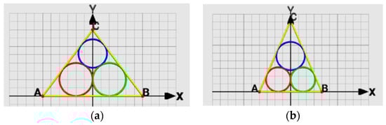 In the Tri(Tn) problem, we have 3Tn variables. There are 3n equations generated by the “circle/side” tangency relation and the 3Tn−1 ”circle/circle” tangency relation. If we want to solve the Tri(T3), Tri(T4), Tri(T8), and Tri(30) problems, for which the solutions are shown in Figure 13, the system of equations will have 18, 30, 108, and 1395 equations. Based on the quadratic growth of the number of equations and our experience regarding the Tri(T2) problem, this is not an effective way to solve the problem. We searched for a mathematical solution from other researchers for Tri(T1) and Tri(T2) and proposed an algorithm to solve the Tri(Tn) problem Tri(Tn) for n > 2.