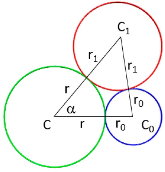 Three circles C, C0, C1 are tangent to each other with radii r, r0, and r1. The angle α between two vectors, from the center of C to center of C0, and from center of C to center of C1, as shown in Figure 6, is equal to cos−1.