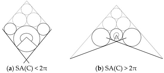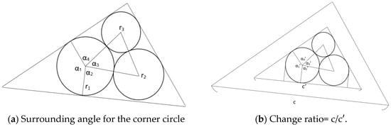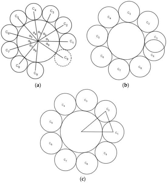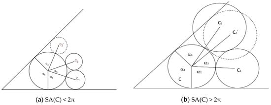 Assume that n circles C1, C2, …, Cn with radii r1, r2, …, rn, are tangent to one circle C and its neighbor circles, and Cn is tangent to C1, as shown in Figure 8c. In this situation, the circle ring from C1 to Cn (n = 9 in Figure 8c, is explicitly tangent to the center circle C. Alternatively, circle C is explicitly tangent to circle rings C1 to Cn. The size of the circle ring is n. When αi is the angle between two vectors that connect the center of Ci and C and C and Ci+1 mod n, we define SA(C) = .