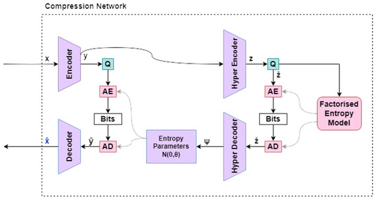 where Ey denotes the expected value over the discrete random variable y and P(yi) is the probability of symbol yi. Thus, it is imperative to accurately estimate the PDFs of the bottlenecks in order to calculate the compression rate [27]. These end-to-end methods for compressing images take the form of a variational autoencoder (VAE), which is a popular probabilistic generative model paired with an approximate inference model [30], commonly incorporating a hyperprior model [31] to convey latent representation distribution [32]. The VAE maps the image to a latent space, which is a space with fewer dimensions that represents the image’s fundamental structure. Therefore, the VAE learns a representation of the image and the hyperprior learns a latent representation of its entropy model. This is achieved by sending side information, which involves the encoder transmitting additional bits to the decoder to modify the entropy model and consequently minimize redundancies. It is important to ensure that the amount of side information transmitted does not exceed the decrease in the code length given in Equation (1), so that there is still compression of the original image. The side information can act as a prior for the entropy model’s parameters, effectively turning them into hyperpriors for the latent representation. Hyperpriors reflect that neighboring elements in the latent representation typically exhibit similar variations in their scales [31].