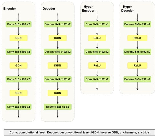 Our VAE network architecture closely resembles Ballé’s hyperprior architecture [31]. In an end-to-end approach, the common rectified linear unit function is replaced by a generalized divisive normalization (GDN) activation function [37], with each code assumed to follow a zero-mean Gaussian distribution, while the deviation is estimated by the side information network based on the hierarchical hyperprior. The bottlenecks of the base encoder, as well as that of the hyper encoder, go separately through quantization and entropy coding, before being combined again in the decoder. The VAE network is presented in Figure 3, while Figure 4 contains the individual network layers.