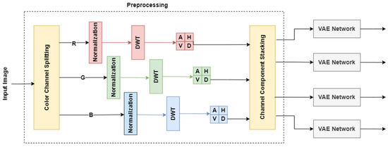 One substantial difference between our approach [26] and that of Ballé [31] is that we employ a different approach to represent the input images before feeding them to the network. Initially, we separate the images into their three color channels (red, green and blue). Then, as a preprocessing step, we apply the discrete wavelet transform (DWT) after the color channels are split. Each of the three resulting images undergoes discrete wavelet decomposition, resulting in four subimages corresponding to the approximation, horizontal, vertical, and diagonal details. Consequently, for each image taken from the original dataset, we obtain a total of 12 subimages. The post-processing step mirrors the pre-processing step. The proposed pre-processing operations are depicted in Figure 5.