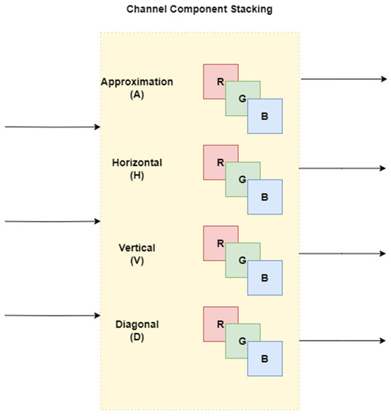 The 3 subimages—one for each color channel— that represent the corresponding detail are combined to form a 3-channel image that is then fed to the corresponding neural network. This channel component stacking is different from our previous work [26] and is shown in Figure 6. The selected wavelet is the biorthogonal 4.4 wavelet, which is comparable to the 9/7 wavelet used in JPEG2000 and is regarded as well suited for lossy image compression [38].