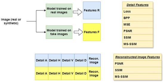 Most techniques rely on image features and distinctive attributes to distinguish between real and synthetic images, as has been described in Section 2. However, we have chosen to study image behavior after entropy-modelled compression. We utilize the quality metrics often seen in compression methods to decide the authenticity of an image. We take advantage of the fact that synthetic images in general fare better after being compressed and retain more of their original quality [39]. Furthermore, the quality of an image post-compression significantly affects the discernment of AI-generated images [40]. In addition, since we created 4 subimages for each initial one, we have more information available. While there are many ways of generating fake media, GAN-generated images are the most recent and the most common type of deepfakes [41,42,43], and we have focused our research on them. However, Diffusion Models have also been popular recently, and we are keen to explore these images too [44,45].