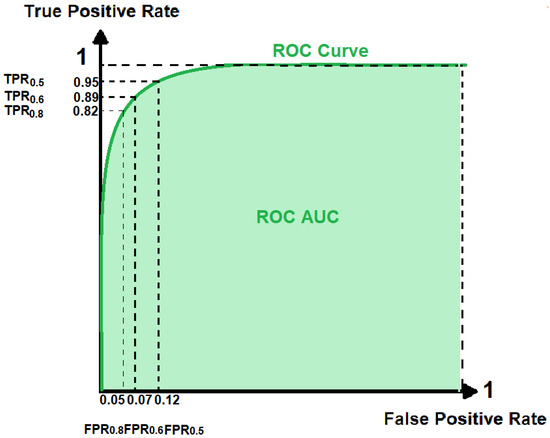 The metrics we used for the evaluation of our binary classifier were accuracy, precision, and recall (also known as True Positive Rate—TPR), as well as the area under the curve (AUC) of the receiver operating characteristic (ROC) curve. The first three metrics are defined in Equations (3)–(5), utilizing True Positives (TP), True Negatives (TN), False Positives (FP), and False Negatives (FN). Unlike accuracy, and like cross-entropy losses, AUC evaluates all the operational points of the model using a Riemann sum. The AUC is calculated using the height of the recall values with the False Positive Rate (FPR). This is defined in Equation (6). A linearly spaced set of 200 classification thresholds is used for the computation of TPR-FPR pairs [54]. The ROC curve illustrates the trade-off between these two metrics. The left side of the curve represents the more “confident” thresholds—a higher threshold results in lower recall and fewer False Positives. On the other hand, the right side of the curve corresponds to the “less strict” thresholds—a lower threshold increases both the recall and the False Positives. The ROC AUC is calculated by measuring the area under the ROC curve and has values from 0 to 1, though this is often changed to percentage form for ease. In Figure 8, we provide a graphical example of obtaining the ROC curve and the AUC from a chosen experiment.