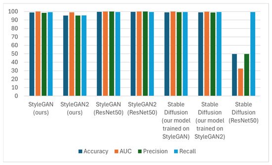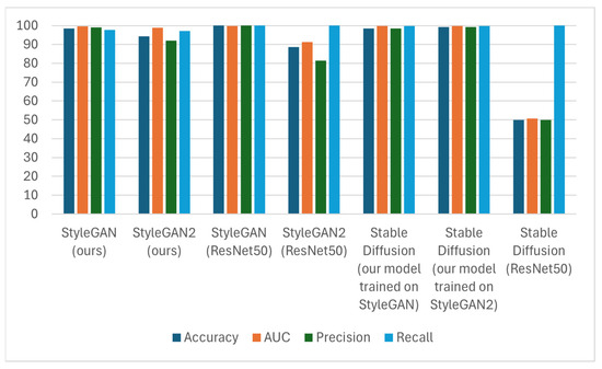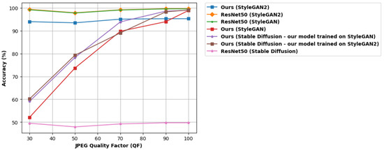 The results clearly show that the proposed method is more effective for StyleGAN compared to StyleGAN2, but this does not hold true for the processed images. After post-processing, the second dataset seems to fare better on the deepfake detection front. This is interesting, given the fact that StyleGAN2 is more recent, and thus the generated face images are more realistic. We observe that our model is less impacted by Gaussian noise compared to ResNet50. The cropping also has no effect whatsoever, which was to be expected since we used a cropped version of the image anyway. The median filter affects our model more than ResNet50, with a 10% decline in StyleGAN accuracy. On the other hand, on StyleGAN2 it seems to work much better, with a less than 2% loss of accuracy. The proposed method also responds well to JPEG compression. However, the present work surpasses the performance of ResNet50 for the stable-diffusion-generated dataset for all types of “attacks”. Our technique maintains a stable performance of high accuracy, in most cases more than 90%. ResNet50, on the other hand, once again only detects real face images, failing in recognizing the diffusion-generated ones. In Figure 11, the performance of different JPEG quality factors is given. It is interesting that while for StyleGAN2 our method has a consistent performance, for StyleGAN it seems to improve as the quality factor increases.