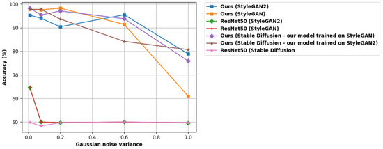 As was stated above, the proposed method performs significantly better than ResNet50 when Gaussian noise is added to the images. This is caused by the nature of the “attack”. Gaussian noise affects the DWT of an image in several ways, primarily through the introduction of high-frequency components. It typically manifests as random variations in pixel values, predominantly affecting the high-frequency components of an image. During the DWT process, these high-frequency components are mapped to the detail coefficients. Consequently, the presence of Gaussian noise increases the magnitude of these detail coefficients. The diagonal detail that contains the high-frequency coefficients is extremely important to our method, as it displays the biggest variance between real and synthetic images. As a result, our compression-based technique performs much better than ResNet50 when faced with Gaussian noise. In order to prove this point even further, Figure 12 shows the behavior of both techniques when the images are “attacked” with Gaussian noise of different variances σ2, with the mean value being consistently zero.