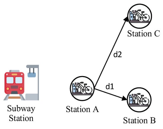 Figure 1. The mutual impact of demand between stations. - Spatial Heterogeneity Factors: Spatial heterogeneity refers to sudden, irregular spatial factors influencing bike-sharing demand. For instance, the addition or closure of stations (referred to collectively as dynamic changes in stations) impacts the demand at surrounding stations. As illustrated in Figure 2, the blue dots represent regular stations, yellow dots represent newly added stations, and purple dots represent stations that have disappeared.