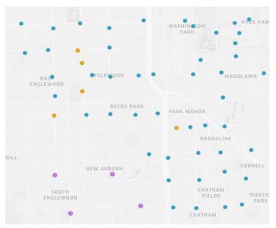 Figure 2. The dynamic changes in station locations within specific regions of Chicago. - Temporal Correlation Factors: Temporal correlation refers to fluctuations in demand at the same station over time. For instance, people’s travel needs differ on weekdays and weekends, leading to varying demand at the same station at different times. Additionally, since the outbreak of the COVID-19 pandemic, people’s travel patterns have been significantly affected, resulting in fluctuations in bike-sharing demand following the pattern of each pandemic wave, as shown in Figure 3.
