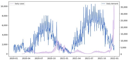 Relationship between daily confirmed COVID-19 cases and predicted demand for bike-sharing.