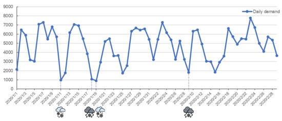 Figure 3. The relationship between daily demand for shared bicycles and daily confirmed COVID-19 cases. - Temporal Heterogeneity Factors: Temporal heterogeneity factors refer to the influence of various unforeseen elements at different points in time on the demand for the same station, including holidays and adverse weather conditions. As illustrated in Figure 4, on days affected by rainy or snowy weather, the demand decreases.