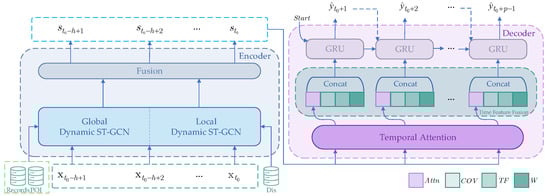 The overall architecture of the proposed model is shown in Figure 5. The architecture consists of an encoder and a decoder. The encoder is composed of a Global-Local Dynamic Spatiotemporal Graph Convolution Network (Global-local Dynamic ST-GCN), capturing dynamic spatiotemporal features to improve prediction accuracy. The decoder comprises Temporal Attention (TA), Time Feature Fusion (TFF), and Gated Recurrent Unit (GRU) to further optimize prediction results by focusing on the dynamic nature of time. Additionally, rich spatial and temporal multi-source features are, respectively, incorporated into the encoder and decoder, providing abundant spatiotemporal semantic information for predictions.