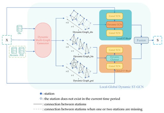 As shown in Figure 6, the Local-Global Dynamic Spatiotemporal Graph Convolution Module first constructs dynamic multi-graphs with different semantics using the Dynamic Multigraph Generator. These semantics include station distances, historical riding records, station POI information, and information about station dynamic changes. The multiple graphs encompass diverse aspects and varying perspectives of dynamic location semantic information. Merging or concatenating these images into a single model input in a simplistic manner would lead to information loss, thereby failing to capture features on different scales. In the middle section of Figure 6, an example of dynamic multi-graphs can be observed. During time period , there are three stations (represented by blue solid circles). In time period , the number of stations increases to four (the newly added station on the right changes from a hollow circle to a blue solid circle). In time period , another station is added on the left, making a total of five stations. Secondly, to preserve the diversity and integrity of information to the maximum extent, the dynamic spatiotemporal graph convolution model is divided into two parts: global and local. The Local Spatiotemporal Module focuses on the feature relationships between each station and its adjacent stations, while the Global Spatiotemporal Module focuses on the feature relationships between each station and all other stations. In the upper-middle part of Figure 6, the dynamic distance graph shows connections only between nearby stations (connections between stations are represented by black solid lines, while the connections of absence stations are shown by gray dashed lines). From time period to , as the number of stations increases, gray dashed lines become black solid lines, but there will still be no connections between distant stations, such as the leftmost and rightmost stations. Therefore, the dynamic distance graph contains local spatial information, which will be input into the local spatiotemporal module. In contrast, the lower part of Figure 6 shows the dynamic historical connection graph and the dynamic POI similarity graph, which are not limited by distance and thus contain global spatial information. Consequently, these two dynamic multi-graphs are input into the global spatiotemporal module together.