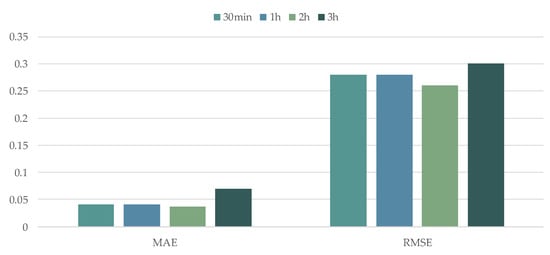 It can be observed that the model performs best when the time granularity is 2 h. Results for 30 min and 1 h intervals are slightly inferior to the 2 h interval, while performance deteriorates the most with a 3 h interval. Generally, smaller temporal granularities can provide more temporal features, making the model more complex and detailed. This can help the model capture more patterns and regularities during training, thereby enhancing prediction accuracy. The time granularities of 30 min and 1 h are frequently adopted in research concerning shared bicycle demand prediction [1,19]. However, our study focuses on the Chicago area during the COVID-19 pandemic, where some stations were closed due to minimal demand. These factors lead to sparse time series data compared to normal periods. In such cases, increasing the time granularity allows each data point to represent a longer period, reducing the proportion of missing data points. Although this approach may sacrifice some analytical precision, we are studying multi-step and relatively long-term forecasting, where some disregard for detailed information is acceptable. Therefore, the key lies in selecting the appropriate temporal granularity based on specific requirements and data characteristics to achieve the optimal balance.