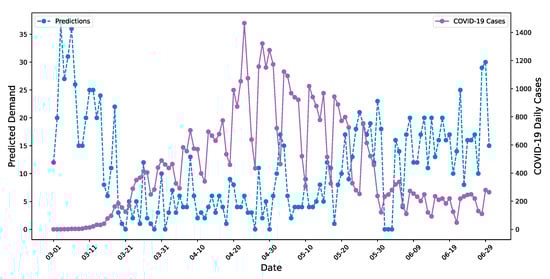 The demand for shared bicycles is correlated with temporal changes, and whenever factors with periodicity and seasonality vary, the demand also changes accordingly. However, when temporal heterogeneity factors come into play, it can have a significant impact on demand. In the decoder part of the LGDMGCN model, through the combined design of multiple time feature data sources and temporal attention, the model can dynamically adjust the corresponding changes in demand based on external features. Considering the backdrop of the COVID-19 pandemic, shared bicycle demand fluctuates in response to the variations in pandemic cases. Figure 10 illustrates the correlation between the daily confirmed COVID-19 cases and the demand for bike-sharing predicted by the LGDMGCN model. The solid purple line represents the daily confirmed COVID-19 cases, while the dashed blue line represents the corresponding predicted demand for shared bicycles. Each data point on the blue line corresponds to the model’s forecast for the day, demonstrating how demand reacts to changes in pandemic severity. The chart clearly shows the trend of predicted reduction in demand during periods of increased COVID-19 cases, and vice versa. Although there is a slight observable lag, it essentially reflects the trend of temporal heterogeneity effects on bike-sharing demand during the pandemic.