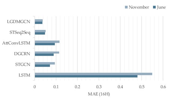As shown in Figure 11, overall, the performance of the models in November, when the COVID-19 pandemic was severe, was worse than in June, when the pandemic was relatively stable. Specifically, the LSTM, STGCN, DGCRN, and AttConvLSTM models exhibited significant performance discrepancies between these two periods, indicating that these models struggled to capture demand fluctuations during severe pandemic conditions. In contrast, the STSeq2Seq model demonstrated smaller performance differences across the periods, possibly due to its PAM module effectively capturing dynamic changes in the time series. The LGDMGCN model, benefiting from the inclusion of COVID-19 case data and temporal attention mechanisms, achieved the best performance in both periods.