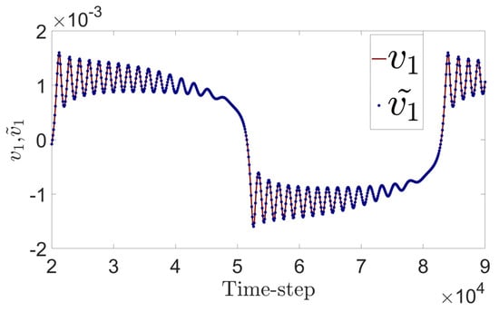 According to model (24) and Figure 1, when , can exceed 99% and approach the convergence value. Choosing implies that in this example, we can only plot the two-dimensional embedded flow field and the one-dimensional reconstructed flow field (since with , the output matrix of the forced linear model consists of only one column vector).