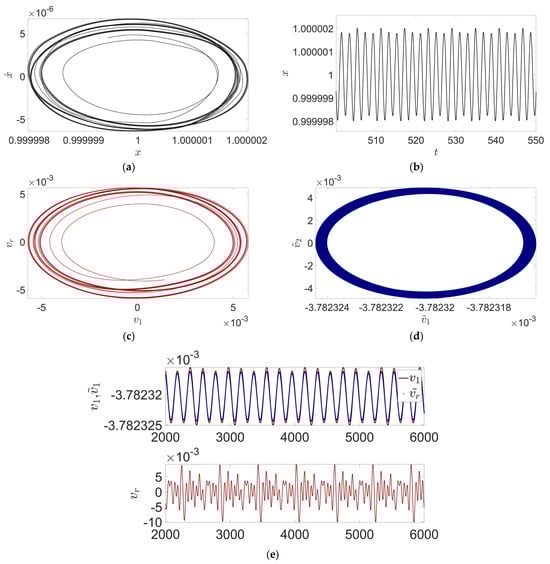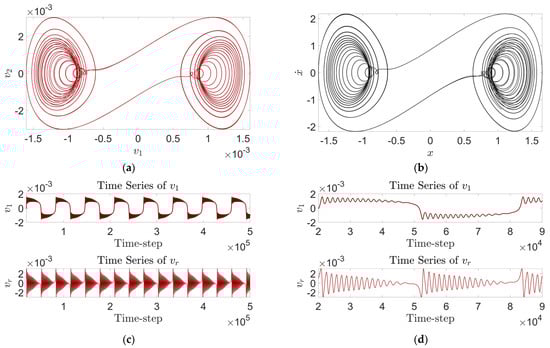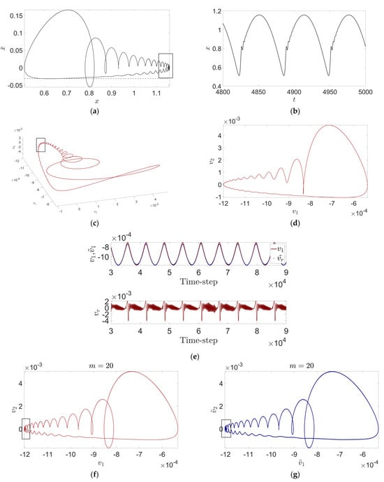 When the parameter set of model (24) is Para2 = , the emergence of bursting oscillations is difficult to observe from the time-history curves (Figure 6b), but a slight oscillatory behavior is indeed observed in the two-dimensional phase diagrams (Figure 6a). Using traditional numerical methods, the researcher may have difficulty in relating the behavior between the 1D time-history curve and the 2D phase diagram.