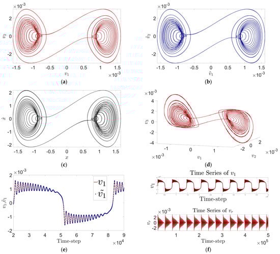 In addition, the “overlapping phenomenon” in the 2D phase diagram (Figure 7a), where the trajectories overlap in the phase diagram, may lead to the inability of the researcher to correctly distinguish the different states of the system. Embedding the flow field in a higher-dimensional embedded flow field may help to understand the reason for the overlapping phenomenon in the 2D phase diagram. Similarly, based on the need of plotting the 3D-embedded flow, we continue to choose At this time, MSE = 3.5956 × . The reconstruction can be roughly judged to perform well by Figure 7e.