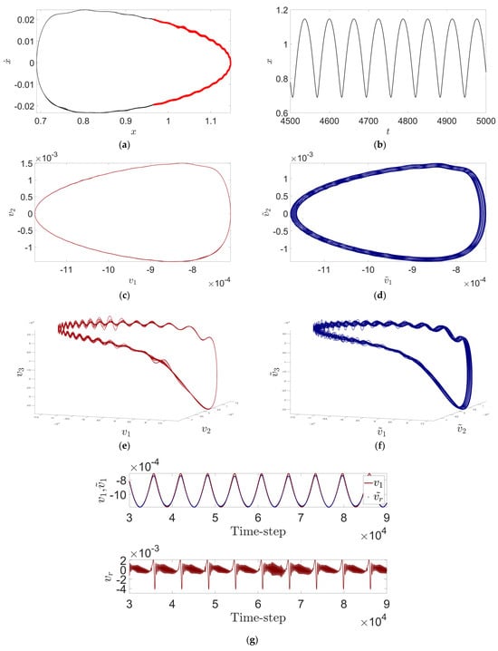 The periodic intermittent bursting behavior on the time series of the forced features (Figure 6g) captures the phenomenon of hidden bursting oscillations in the time-course profile. The construction of a three-dimensional embedded flow field and its reconstructed flow field demonstrates richer dynamical features of the dynamical system (23) with the parameter Para2. For example, the alternation of low-frequency large-period oscillations and high-frequency small-period oscillations is more obvious in Figure 6g,f, which helps the researcher to understand the oscillatory behaviors of the red part of the two-dimensional phase diagrams, as well as to prevent the researcher from misjudging whether or not bursting oscillatory phenomena occur by observing the one-dimensional time-history curve directly, and thinking that bursting oscillatory phenomena occur or not. and avoiding the researcher from misjudging whether the bursting oscillation phenomenon occurs or not by directly observing the 1D time-history curve and thinking that the bursting oscillation phenomenon does not occur.