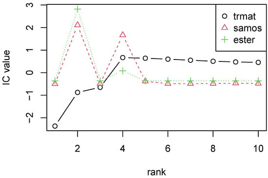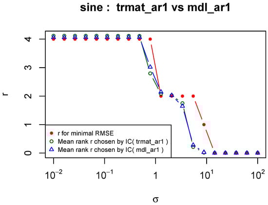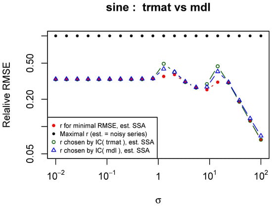 In this section, we consider two methods, namely ESTER [] and SAMOS [], which are not related to information criteria. These criteria are based on signal subspace properties and, in the specific case where the signal subspace has rank r and is extracted exactly, they yield the value for rank r. These methods are based on the concept of separability in SSA [Sections 1.5 and 6.1] in [] and aim to identify separability points. The criteria are applicable when the signal is approximately separable from the noise. However, within the signal, its components may also be separable, which makes the methods appear unstable despite the strong advantage that they are directly based on SSA properties. Another disadvantage of the criteria is that they cannot specify , i.e., they cannot determine the case of no signal.