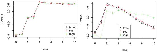 We will consider (8) (SVD) and (9) (TRMAT) with the normalized number of parameters given by (10) using the information criteria (4). Recall that the best rank corresponds to the maximum value of a criterion. Preliminary experiments have shown that only the BIC-penalty criteria turned out to be working, and we will consider it further. A graph of flattens out after growth to the correct rank, so the maximum point is determined unstably and the rank is usually overestimated.