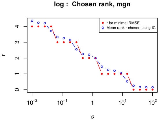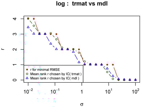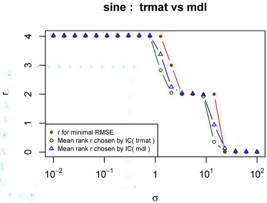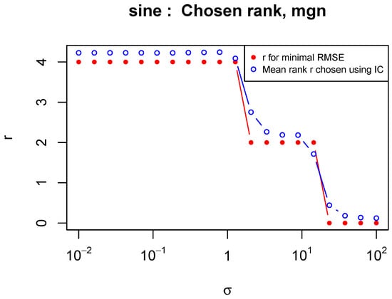 In the problem statement considered in this paper, the correct order of models is generally not defined. Therefore, we will compare the estimated ranks (model orders) with the optimal rank r, which gives the minimum error of the signal estimation obtained by (2). Accordingly, we will compare the RMSE of the signal estimation at the estimated rank with the minimum error at the optimal rank. Since the best approximation depends on the noise level, we will consider the quality of the criteria depending on the noise level.