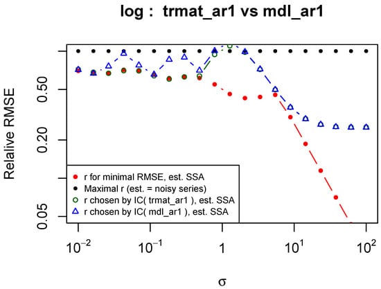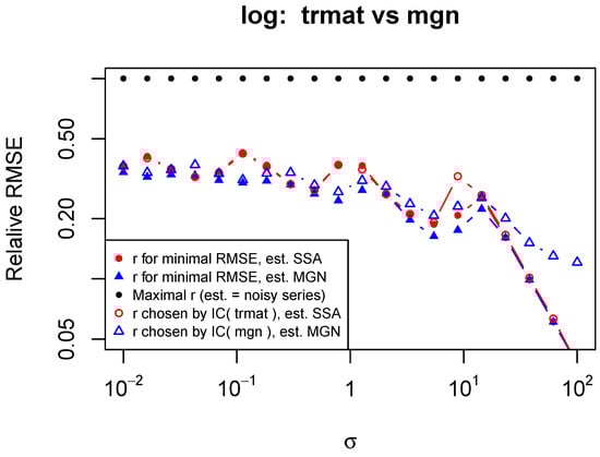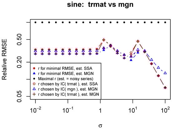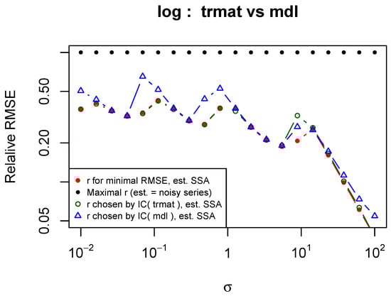 Let us turn our attention to the issue of computational cost. In the case of white noise, the SVD and MDL methods have the same cost as SSA itself, which is . The TRMAT method requires an additional computation that can be implemented at the same asymptotic cost as . Consequently, TRMAT is slightly more expensive. The MGN method is significantly more expensive, as demonstrated in [], with a computational cost of one iteration being . However, the number of iterations required for convergence can be considerable.