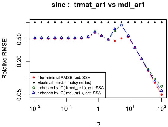 In the case of SSA, when the singular value decomposition is performed once and the signal estimation is generally not a low-rank series, three variants, MDL, SVD, and TRMAT, were considered in the BIC version, since the penalty from the AIC criterion leads to a significant overestimation of the signal rank. In this case, the MSE signal estimation error (an estimate of ) used in the information criteria is not based on the time series decomposition after diagonal averaging, but on the estimated noise matrix before hankelization. In our proposed version of TRMAT, the Hankel structure of the trajectory matrix is accounted for using weights.