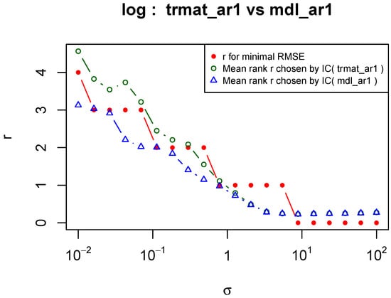 Example ‘log’: Dependence of rank estimation on red noise level, TRMAT and MDL.