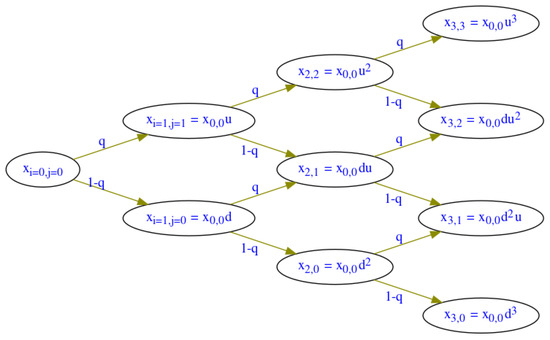The original BOPM [3] was developed to price options on underlying whose price evolves according to a lognormal stochastic process. The BOPM assumes the underlying price follows a GBM (Equation (5)). The BOPM is a discrete-time, finite-horizon, finite-state approximation of the continuous process. The BOPM is tree based, where a “recombining tree” is constructed, meaning we have price outcomes after i time steps. For each state (price) random the resulting (two nodes) from are (upper node) and (lower node). In BOPM, u is the “up” factor (by which the asset price increases and ), and q is the probability of an “up” move. The graphical structure of the Binomial Option Pricing Model (BOPM) is illustrated in Figure 1. For a detailed explanation of the calibration of q and u in BOPM, we refer to Appendix B and [23].