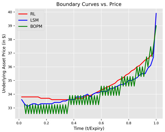 The decision boundary curves solved using LSM and RL for the case with the calibrated GARCH price model are plotted in Figure 9. The decision boundary curves for the LSM and RL methods follow a similar trend, where the boundary curves at the expiry time approach the strike price ().