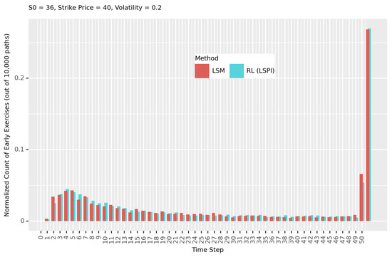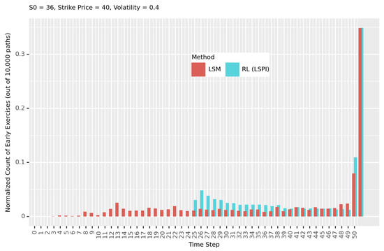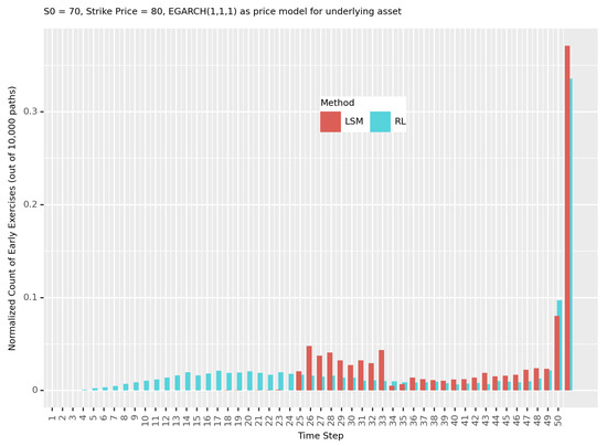 The resulting decision policies using LSM and RL, illustrated in Figure 13, were applied to 10,000 price paths sampled from the calibrated EGARCH price model with a spot price of and strike price . The frequency of exercise times for each method is shown in Figure 14. In both methods, approximately 35% of the paths are not exercised early. However, the RL method exhibits more early exercises before time step 25, as indicated by its decision boundary (discussed in the previous section).