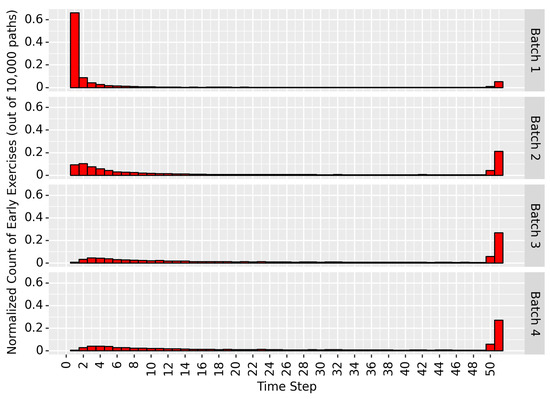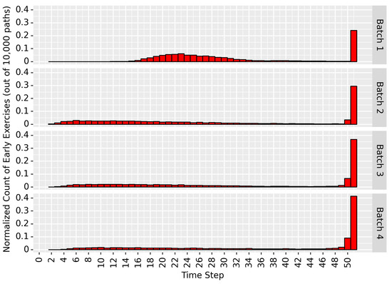 Figure 11 shows the development of the frequency of exercise time, implying the development of the RL decision policy over the course of training. Initially (batch 0), the RL decision policy predominantly recommends exercising the option during the middle stages of the timeline (time steps between 15 and 30). However, with more batches of training, adjustments to the RL decision policy result in progressively fewer middle-stage exercises and more early-stage exercises. By the end of the fourth batch (Number 3 on the right side of Figure 11), the frequency of exercise time stabilizes, which indicates the RL decision policy converges.