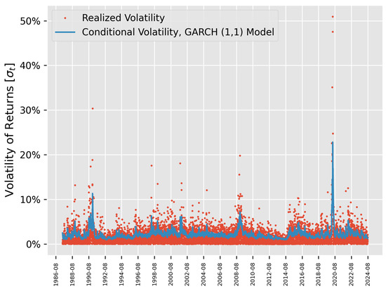 The Generalized Autoregressive Conditional Heteroskedasticity (GARCH) model is widely used to model time-varying volatility in econometrics [24]. The process is defined as