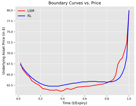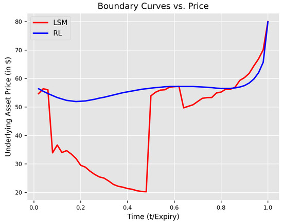 The two methods, RL and LSM, were used to find the decision boundary (policy) shown in Figure 13. The decision boundaries obtained from both methods were then tested on 10,000 paths to estimate the option value. Each method was repeated ten times to account for the stochastic nature of underlying price uncertainty, modeled by EGARCH(1,1,1). The average option value, with , strike price = USD 80 was USD 15.01 for the RL method and USD 14.91 for the LSM method.