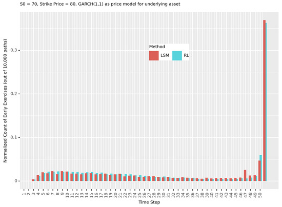 The resulting LSM and RL decision policies, as illustrated in Figure 9, are applied to 20,000 price paths sampled from the calibrated GARCH price model with the spot price . The frequency of exercise time for each method is shown in Figure 10. Again, RL leads to a similar frequency of exercise time as LSM does. For approximately 7000 out of the 20,000 paths, LSM and RL suggest not exercising the option within the expiry time; in other words, the option is suggested to be exercised before/at the expiry time for around 14,000 paths.