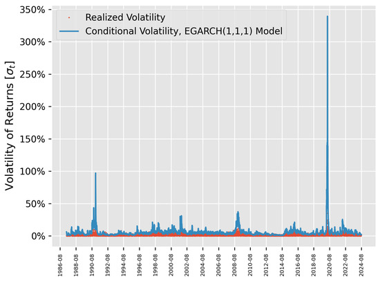 For using the EGARCH(1,1,1) model, five parameters , , , , and need to be estimated. Similar to the previous subsection, the Maximum Likelihood (ML) method is employed to estimate these parameters based on historical data.