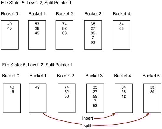 To continue the example, we assume that we insert a record with key 12. Since and , the record is placed into Bucket 4. With the insertion of this record, the load factor, i.e., the average capacity of the buckets, exceeds 3, which, in our example, triggers a split. The bucket to be split is the one given by the split pointer, namely Bucket 1. In an Extensible Hashing scheme, we would split because we try to insert into an overflowing bucket and then split that bucket. However, LH uses a predefined order of splits, and the turn of Bucket 3 will come only after another intervening split. LH creates a new Bucket 5. It then rehashes all the records in Bucket 1 using the new file state. As a simple optimization, the address recalculation can skip the evaluation using since we know that its value has to be 1 because otherwise, the record would not reside in Bucket 1. Thus, calculating , , and has LH move the three records into the new bucket. If we were to recalculate the addresses of all other records in the data structure, they would not change, as the only change in the execution of the addressing calculation is the comparison with the split pointer. The lower part of Figure 1 shows the state of the LH file after the split as well as the split.