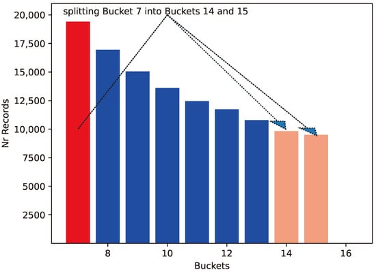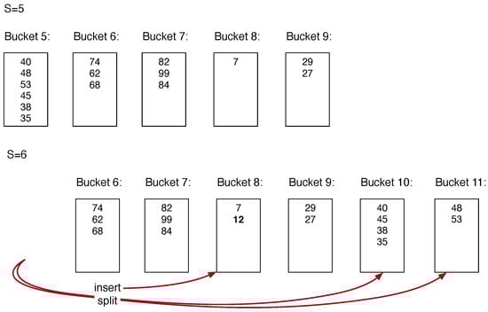 We now reuse our previous example to show the evolution of an SH file in Figure 4. LH uses keys that are unsigned integers, but SH uses keys that are floating-point numbers in Therefore, we divide the keys by 100 so that key 40 is translated to key 0.40. Using the SH addressing algorithm in Figure 3, we obtain the picture in Figure 4 (top). Since , the range of buckets is from Bucket 5 to Bucket 9. We can see that the records inside a bucket are all in a sub-interval of . Therefore, without calculation, we can guess that the record with key 12, translated to 0.12, is either in Bucket 8 or Bucket 9. After insertion of the record with key , the average load of the buckets is again higher than the threshold of 3, and Bucket 5 is replaced with Buckets 10 and 11. The mathematics of the address calculation algorithm again guarantees that no records outside of the split bucket are moved when we recalculate with the adjusted s.