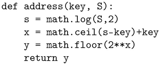 - Chu, J.-H.; Knott, G.D. An analysis of spiral hashing. Comput. J. 1994, 37, 715–719. [Google Scholar] [CrossRef][Green Version]