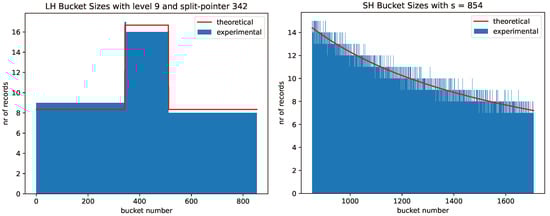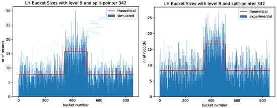 Linear Hashing is attractive because of its conceptual and architectural simplicity. As we have seen, the average number of records per bucket varies between buckets that have already been split in an epoch (when the level is constant) and those that are yet to be split. Figure 5 provides an example with level 9 and split pointer 342, and a total of 8000 records. Buckets 0 to 341 on the left and Buckets 512 to 853 on the right have, on average, about half as many records as Buckets 342 to 511. On the left, these numbers were obtained using random numbers as stand-ins for the hash of keys, whereas on the right, we used the first 8000 words in alphabetical order from an English dictionary as keys. The word list was compiled by J. Lawler of the University of Michigan. We then calculated the SHA1 hash of these keys and used the first 16 hexadecimal digits, transformed into an integer, as the keys. Remarkably, and by sheer accident, in this example, the hash of the keys is slightly smoother than the hash using random numbers. The figure illustrates that with small bucket sizes, the variability in the number of keys is large; however overall, the maximum number of records in a bucket yet to split is about twice as large as the maximum number of records in a bucket that has already been split in the current epoch. Only at the end of the epoch, when the split pointer is zero, will all buckets have the same expected number of keys. In general, with level l and split pointer s, the buckets numbered 0 to and to have already split and have, on average, half as many records as the remaining buckets.