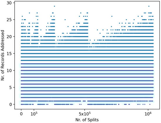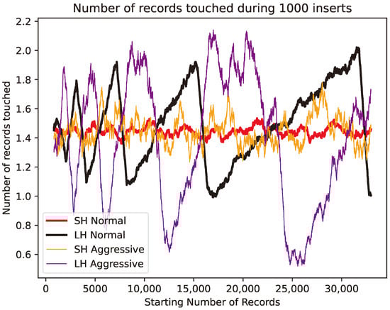 Spiral Hashing’s selling point is its avoidance of this fringe behavior. The probability of a record belonging to Bucket i is . The size of the bucket that is split is always rather close to 1.44 times the average. Thus, instead of a cyclic fringe behavior, SH shows near-constant movement, independent of the number of records, but it is still subject to random fluctuations. In Figure 8, we can see that the use of the normal and the more aggressive triggers results in similar, near-constant behavior. However, the more aggressive trigger results in greater variability.