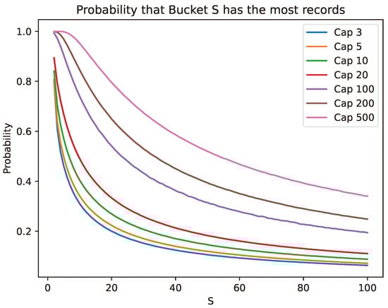 Spiral Hashing assigns a record to Bucket i with probability for i between s and . The lowest-numbered bucket has the largest expected number of records and is always the next one to be split. However, it is often not the bucket with the actual largest number of buckets. The number of records in a bucket follows a binomial distribution, allowing us to calculate the exact probability that one bucket contains more records than another. There does not, however, seem to be a simple, closed formula for this probability. Instead of using the Central Limit Theorem and approximating with the normal distribution, we used the Las Vegas method to determine the probability that the next bucket to be split actually has the largest number of records, as we would prefer. However, this was not the case, as our results in Figure 9 show. As the nominal bucket capacity increases and the number of buckets remains small, the probability that Bucket s has the most records increases, but for larger structures, that probability diminishes quickly.