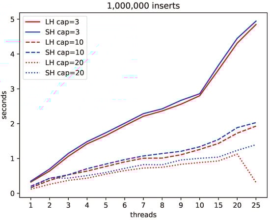 We varied the number of threads used and the nominal bucket capacity. We used the load factor (the ratio of the number of records to the number of buckets) as the split trigger. Thus, a hash table with 1,000,000 records and a bucket capacity of 3 has 333,334 buckets, and when it grows to 2,000,000 records, it has 666,666 buckets.