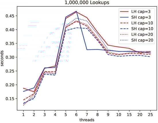 We wanted to compare the efficiency of the two data structures. The advantage of LH is its simplicity and elegance and, in comparison with SH, its addressing mechanism that avoids floating-point calculations. The advantage of SH is its better fringe behavior and tail latencies for key-based operations. In fact, we discovered one key (an unsigned int in C++) and one file state where the SH addressing function, when implemented in a straightforward manner with C++ functions, gave a wrong address because of a rounding error. This single instance forced us to include an additional check in the SH addressing mechanism. Because we wanted to compare the relative merits of both data structures, we decided to implement a threaded, in-memory data structure with short records. Alternatives would be a distributed data structure (such as LH* []) or, more prominently, an in-storage data structure. Our choice should highlight the relative differences between the two data structures.
