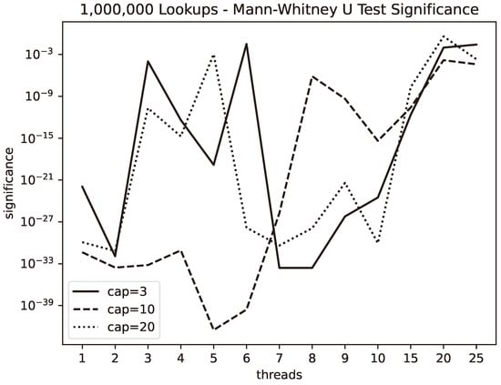 p-values for the null hypothesis of equal lookup times using the Whitney–Mann U-test.