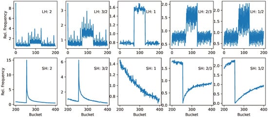 We show the results of the altered hash function in Figure 15 for , , , , and . We simulated the hash scheme for 200 buckets and an average of 1000 records per bucket (for a total of 200,000 records). The y-axis shows the number of records per bucket in multiples of 1000, i.e., the relative frequency. For LH, we see a much greater frequency for Bucket 0 and and increased variance for LH when For SH, the top frequency is much larger when .